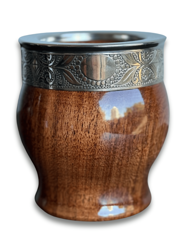 Este mate imperial está elaborado en madera de algarrobo grueso de alta calidad, seleccionado y trabajado por artesanos bajo exigentes estándares de fabricación. Presenta fleje de alpaca y virola lisa, perfecta para personalizar con grabado láser.